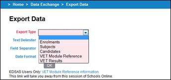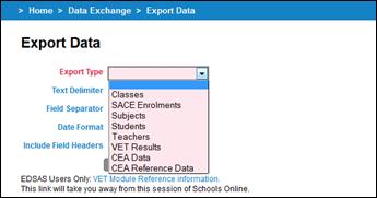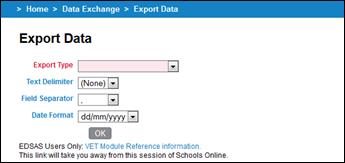 The Data Exchange section exchanges data with administrative systems conforming to the Schools Online file formats.